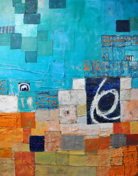 An exhibiting artist for over 25 years, Bruce has steadily oriented her craft toward capturing and encouraging the process of artmaking as an end in its own right. An intuitive combination of painting, collage and textile art, Bruce’s work represents the culmination of a holistic creative practice developed by the artist over several decades, often addressing themes of life, renewal and healing. “So many of the materials I use in my work have magically found their way to me. Years ago I think I was more concerned with what it meant to use found materials or created or store-bought materials, but now I’ve just completely surrendered to the idea of letting objects, fabrics, materials find me,” said Bruce. Referred to by the artist simply as paintings, her mixed-media compositions are in fact patchworks of painted fabric, individually selected from Bruce’s vast archive and pasted directly onto the canvas in a textile collage that can sometimes resemble a quilt. The result of a slow and perpetual artistic method, each work represents hours of treatment, selection and juxtaposition until the whole becomes manifestly greater than its parts. Bruce’s process ends with her titling of each work: a poetic articulation of what the work is at this point capable of expressing for itself.