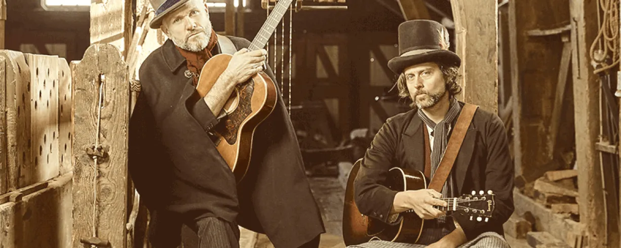 Sons of Town Hall, the transatlantic folk duo of American songwriter/author David Berkeley and British songwriter/producer Ben Parker, is creating a new genre of performance art—part live concept album, part theatrical experience. Under the aliases Josiah Chester Jones and George Ulysses Brown, Berkeley and Parker craft a mythic universe featuring two 19th-century vagabonds who travel the world in a hand-built boat, seeking adventure and love while escaping troubled pasts. Designed as a live companion experience to their radio-theater podcast Madmen Cross The Water, Sons of Town Hall weaves wild and hilarious stories into heartbreaking and rousing songs, bringing audiences along on a captivating journey.