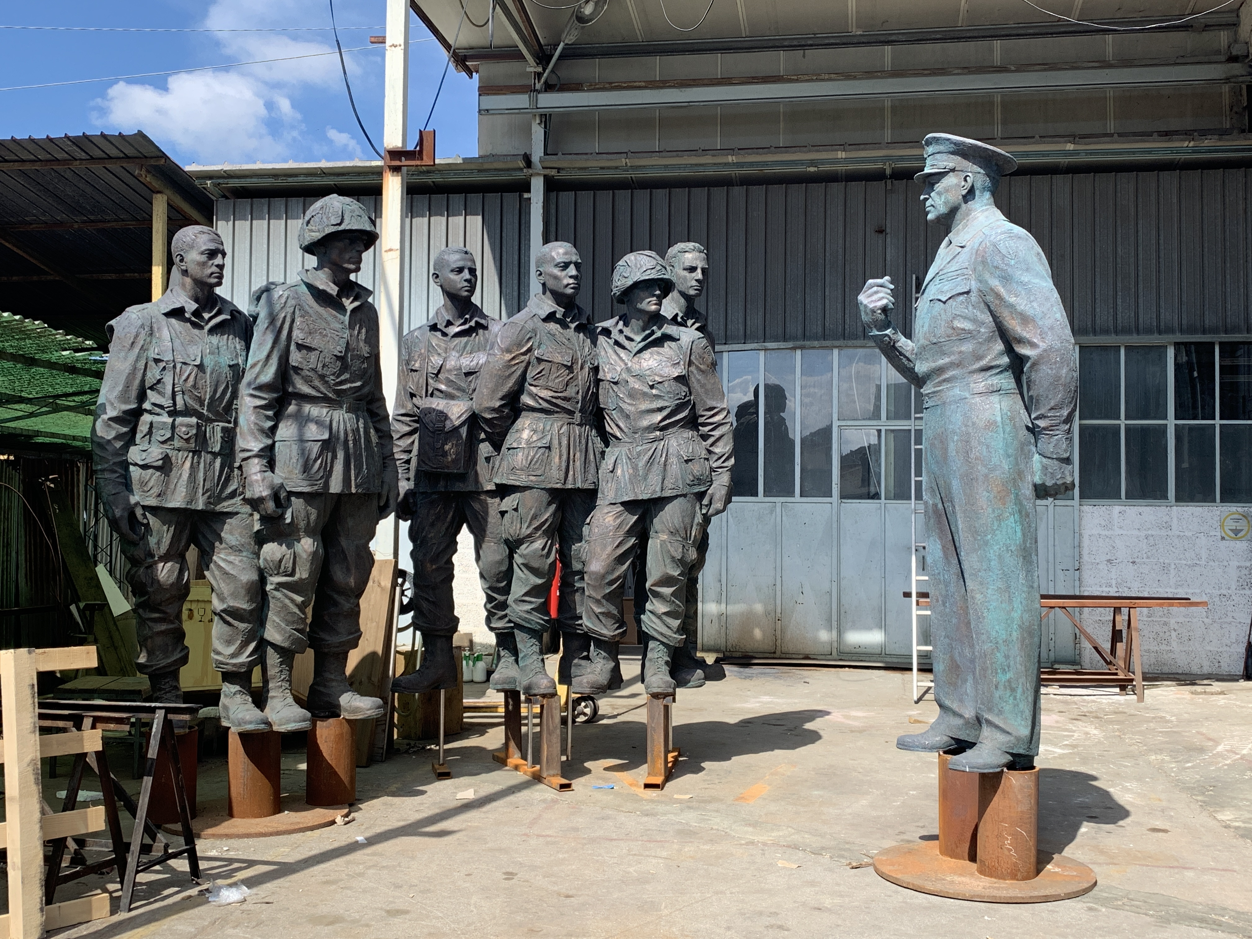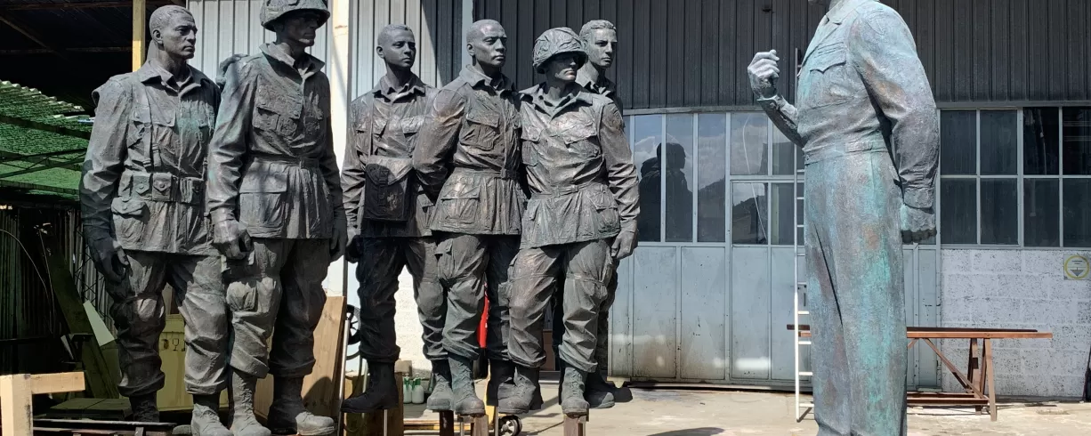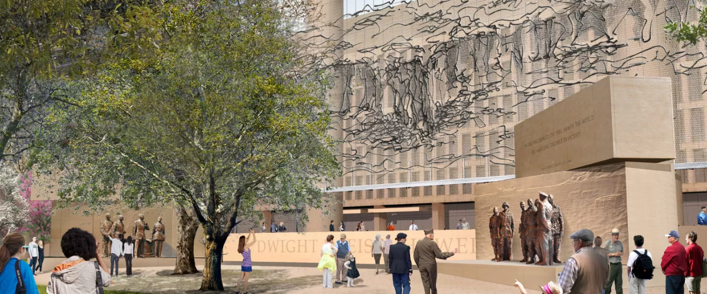 Commemorating his military accomplishments, the memorial's core features heroic-size sculptures of General Eisenhower and paratroopers of the 101st Airborne Division before the Battle of Normandy. Behind the sculptures is a bas relief depicting the beach landings on D-Day, June 6, 1944.