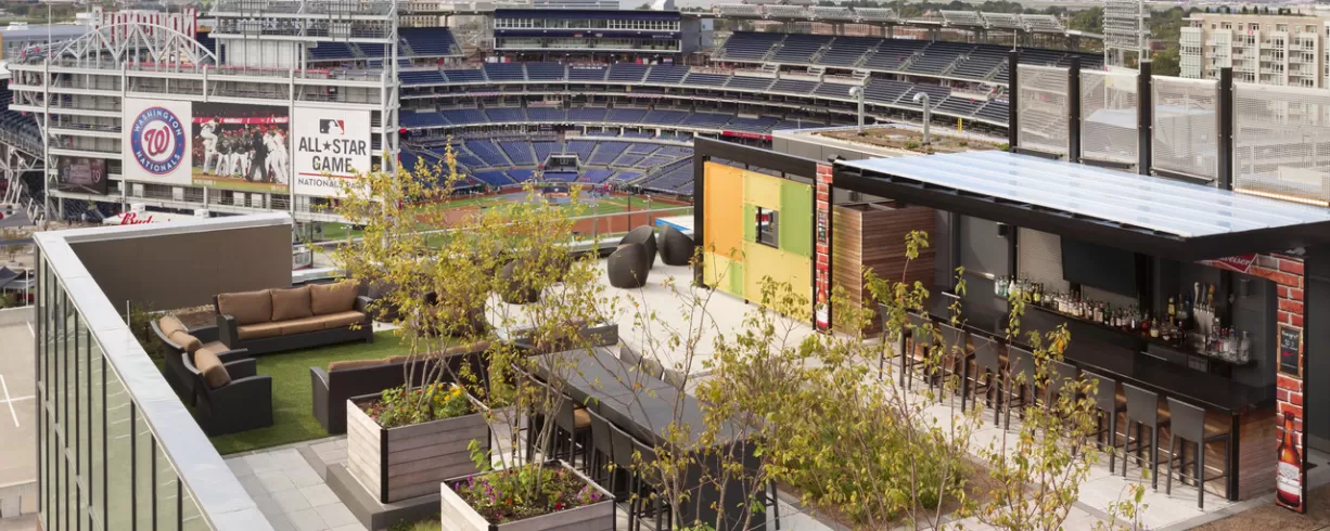 People in Washington DC, love their rooftop bars and lounges and just one visit to Top of the Yard, our rooftop bar and unique outdoor event venue, and you can see why. Enjoy monumental views of downtown Washington DC, including exclusive views directly into Nationals Park, as well as views of the Capitol Riverfront, multiple monuments and more. Top of the Yard is open seasonally with special hours for baseball home games and specials events at Nationals Park.