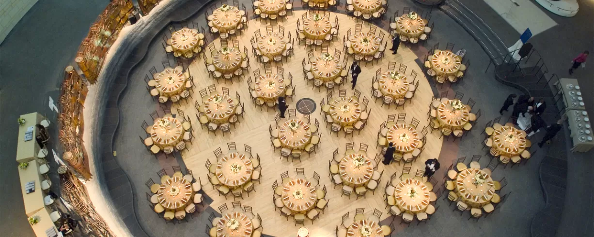 Situated near the U.S. Capitol, the National Museum of the American Indian is a striking presence on the National Mall. The building's curvilinear form evokes a wind-swept mesa. Additional features such as the museum's east-facing entrance, prism window, and 120-foot-high Potomac atrium spaces are further expressions of Native sensibilities.