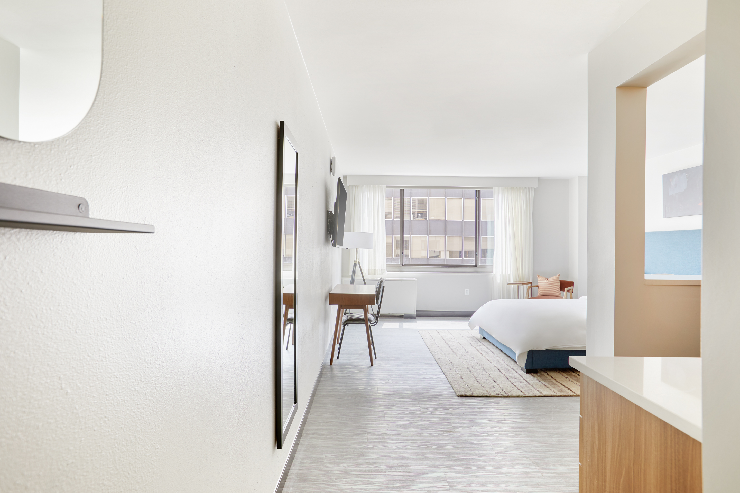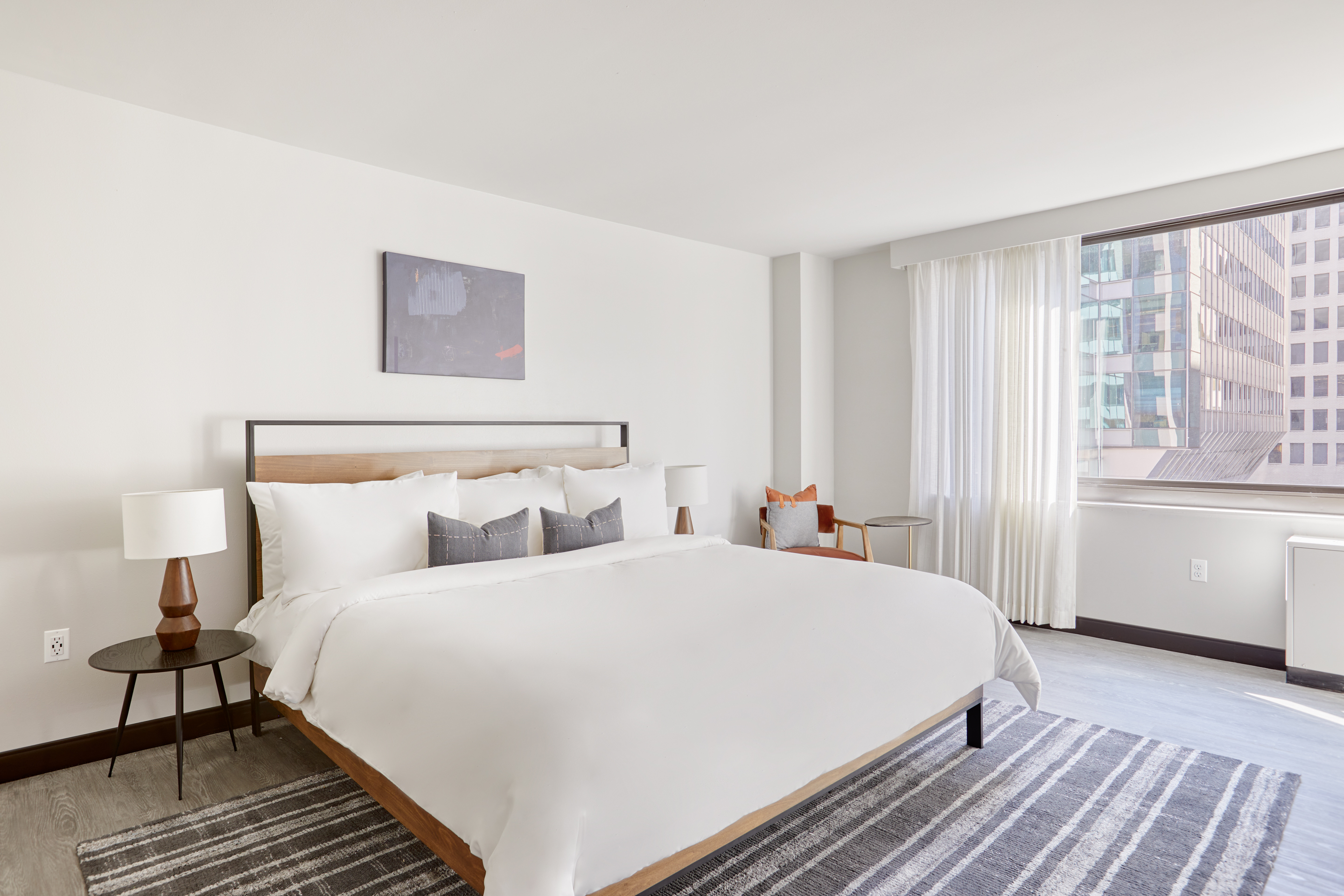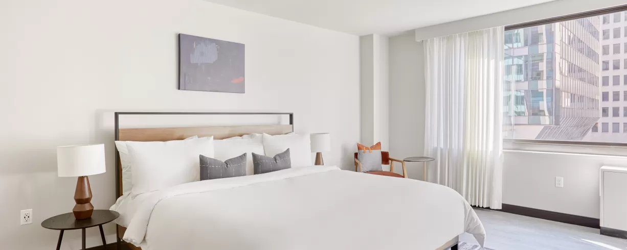 Our spacious guest rooms are your personal oasis, designed with your comfort in mind. Indulge in plush bedding, sleek furnishings and city views. Unwind in style with our exclusive amenities, including full kitchens, state-of-the-art fitness studio, daily morning coffee, smart TVs, valet parking and a meeting room that accommodates 30. Explore the city's iconic landmarks, world-class museums, and thriving arts scene with ease.
