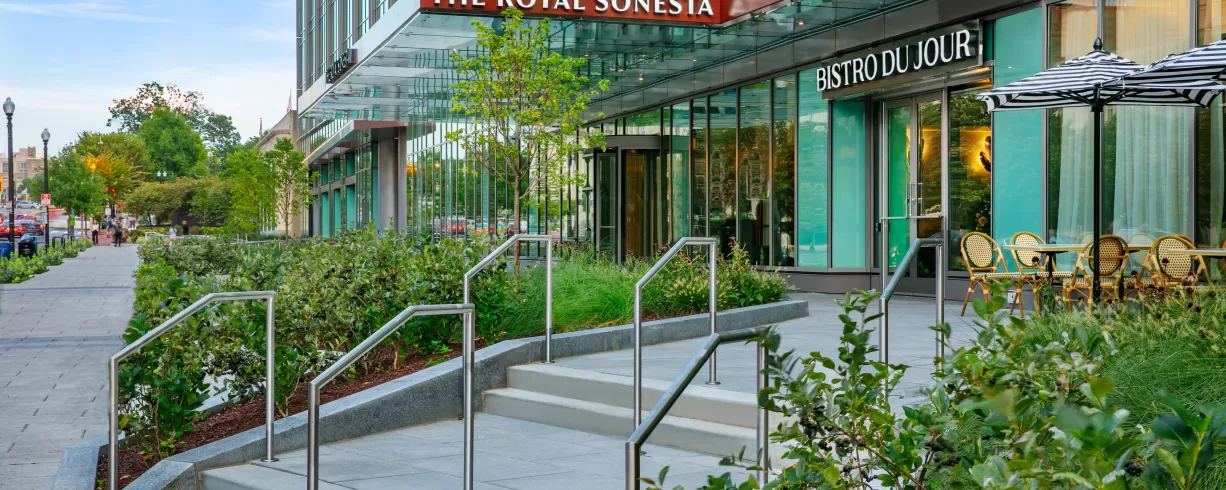 A cleansing palette of neutrals with artistic accents sets a calming tone in our lobby and well-appointed rooms. Our French bistro restaurant promises a sophisticated, savory experience. Embodying the fusion of green, wellness, and tech-forward design, our hotel is LEED Gold Certified with a WELL Certified Core/Shell and boasts an on-site fitness center and yoga studio, EV charging stations and well-equipped networking spaces throughout the property. Our penthouse conference center and ballroom with private terraces offer a breathtaking backdrop, ideal for collaboration or celebration.