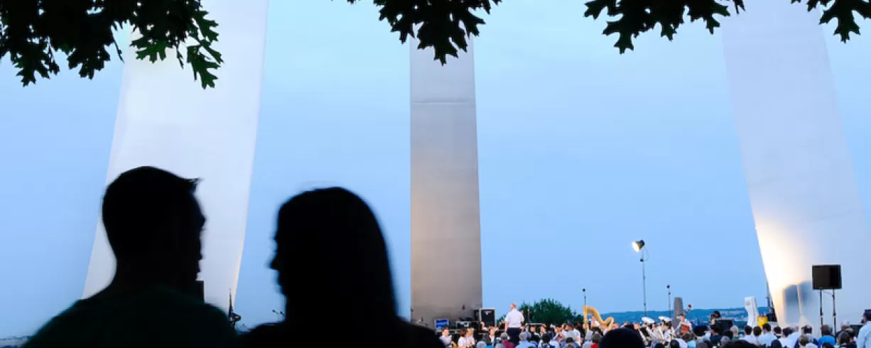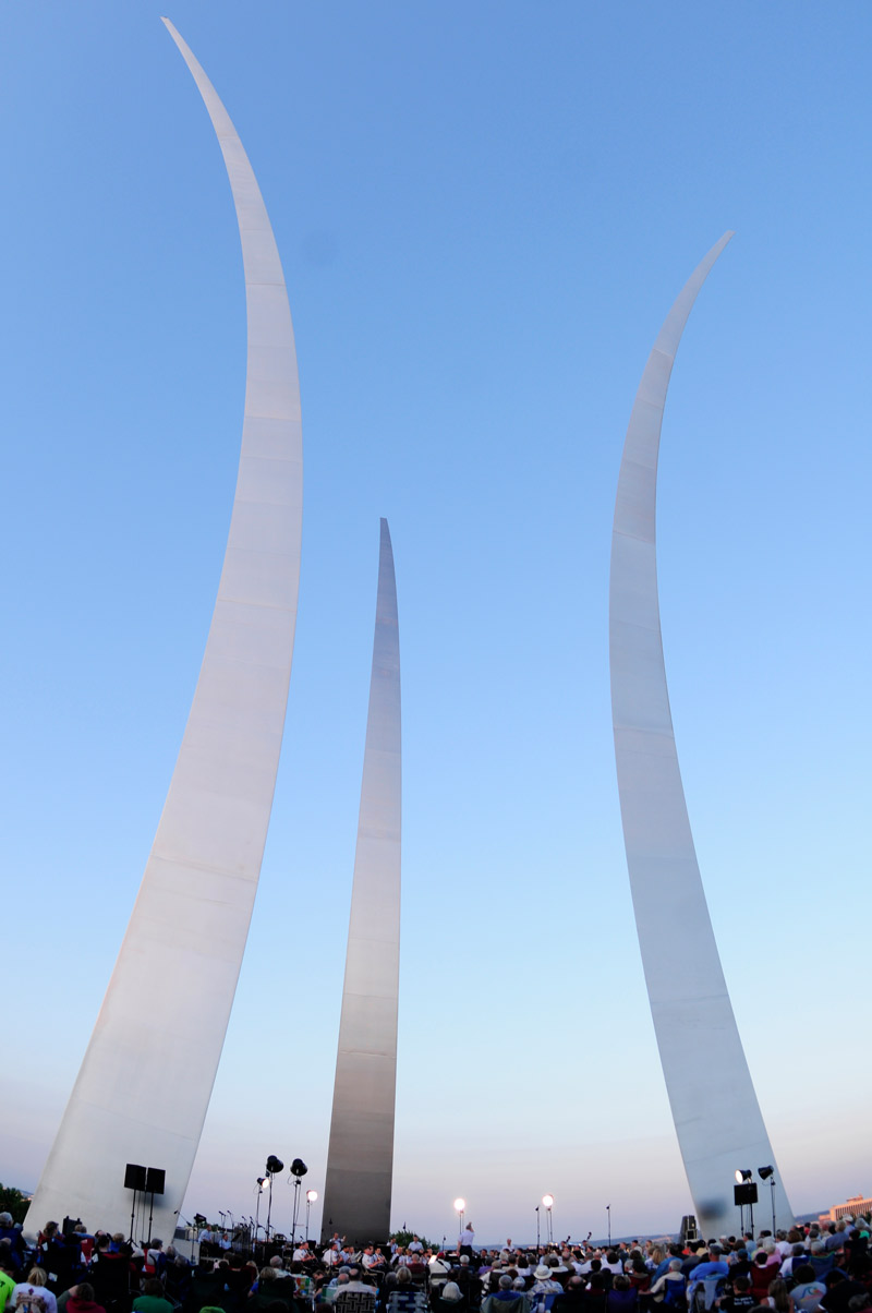Located in Arlington, VA, the United States Air Force Memorial honors the service and heritage of the men and women of the United States Air Force. The three stainless steel spires reach a height of 402 feet above sea-level. It is adjacent to the Arlington National Cemetery and overlooks the Pentagon.
