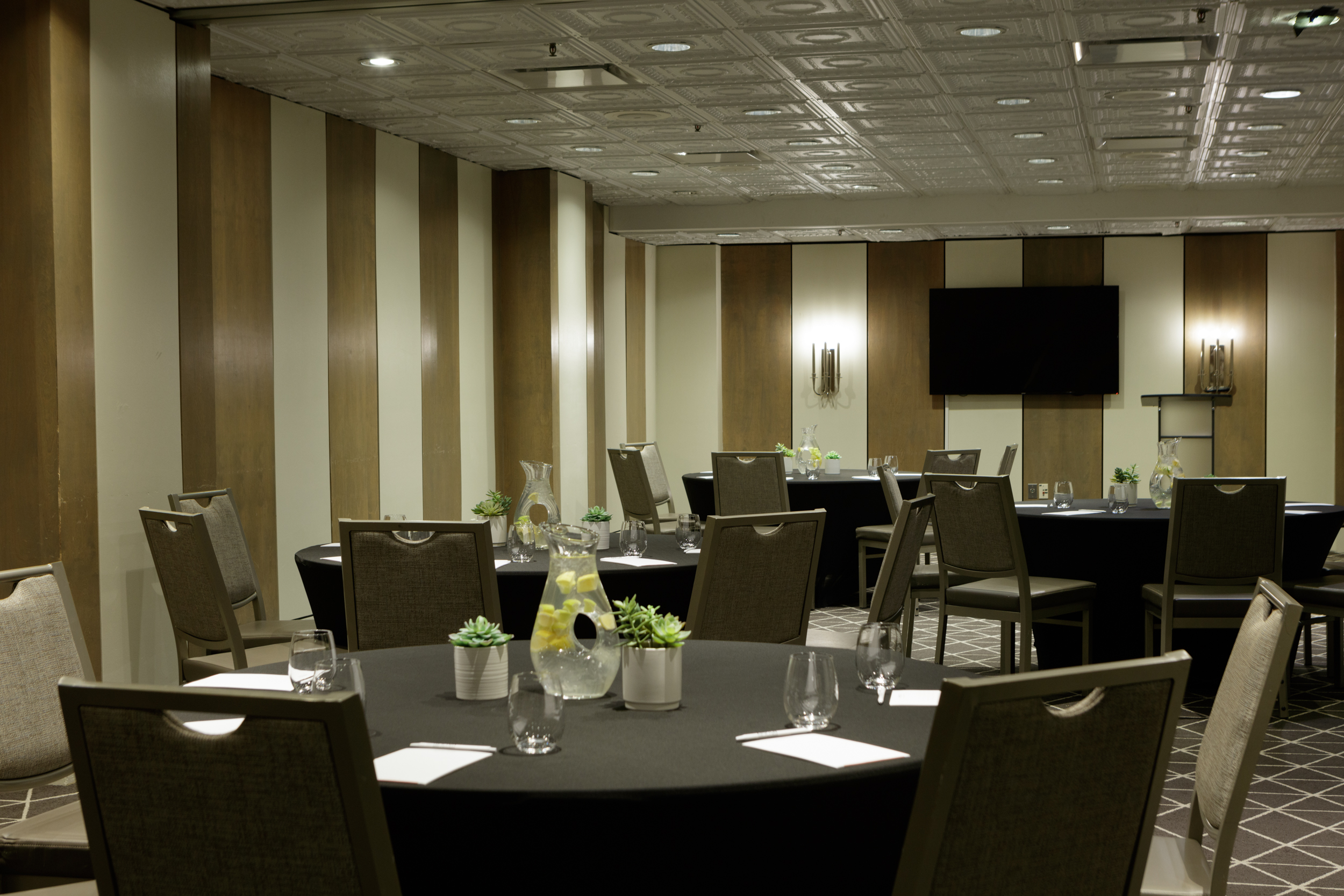 The hotel offers the Leaders Meeting room conveniently located off the lobby level with generous pre-function space for food and beverage events. The mezzanine level offers two boardrooms overlooking the lobby with natural light. All rooms offer built in flat panel screens. Additional AV is offered by our on-site AV company, AVMS. A separate room overlooking the bar area is located on the mezzanine level as a separate area for meal service.