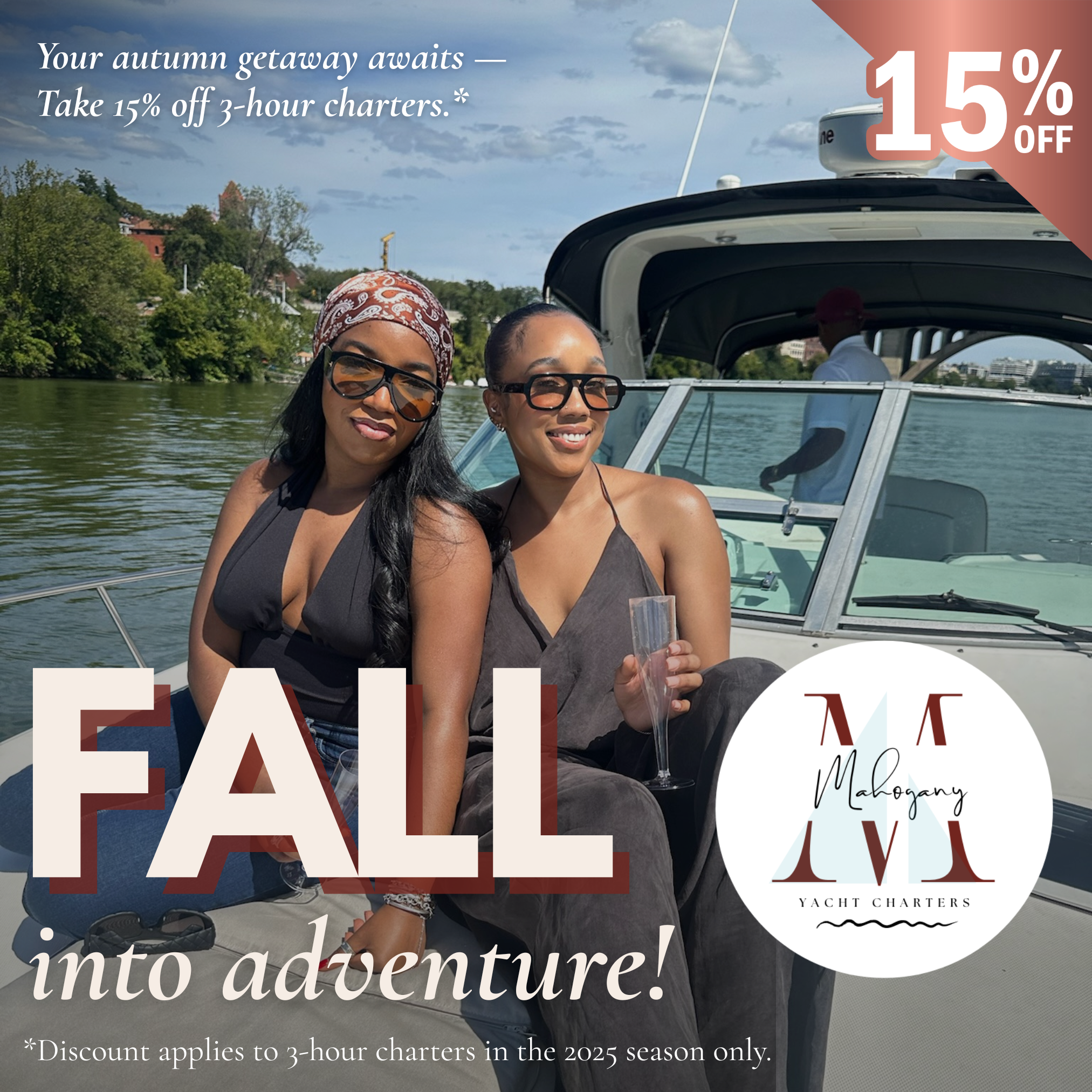 From proposals, milestone birthdays or just a day on the water with the girls, Mahogany Yacht Charters has something for everyone! With luxury and service top of mind, Mahogany Yacht Charters' main goal is to provide all guests with five-star accommodations and best-in-class service while aboard the charter. With breathtaking views of Washington, DC along with the Potomac River — drop anchor with Mahogany Yacht Charters, we can't wait to sail with you!