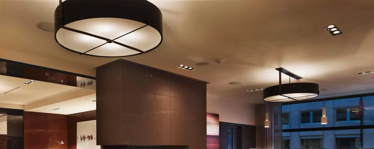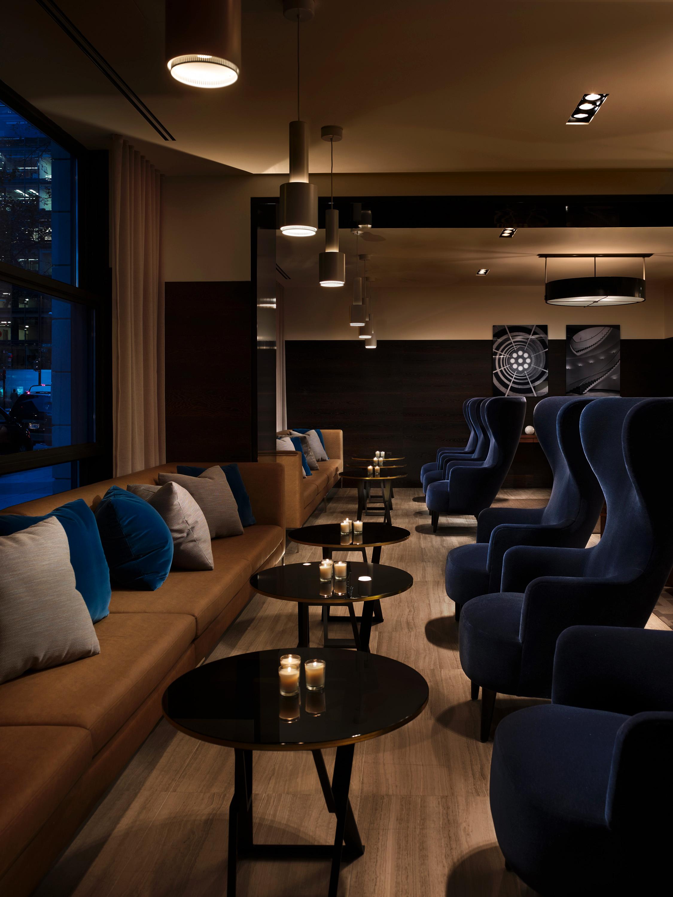 A lounge is approximately 4,000 square feet of luxurious, open flow amenity spaces, including a stunning bar and fireplace, and contemporary, comfortable seating with open views onto the street scape