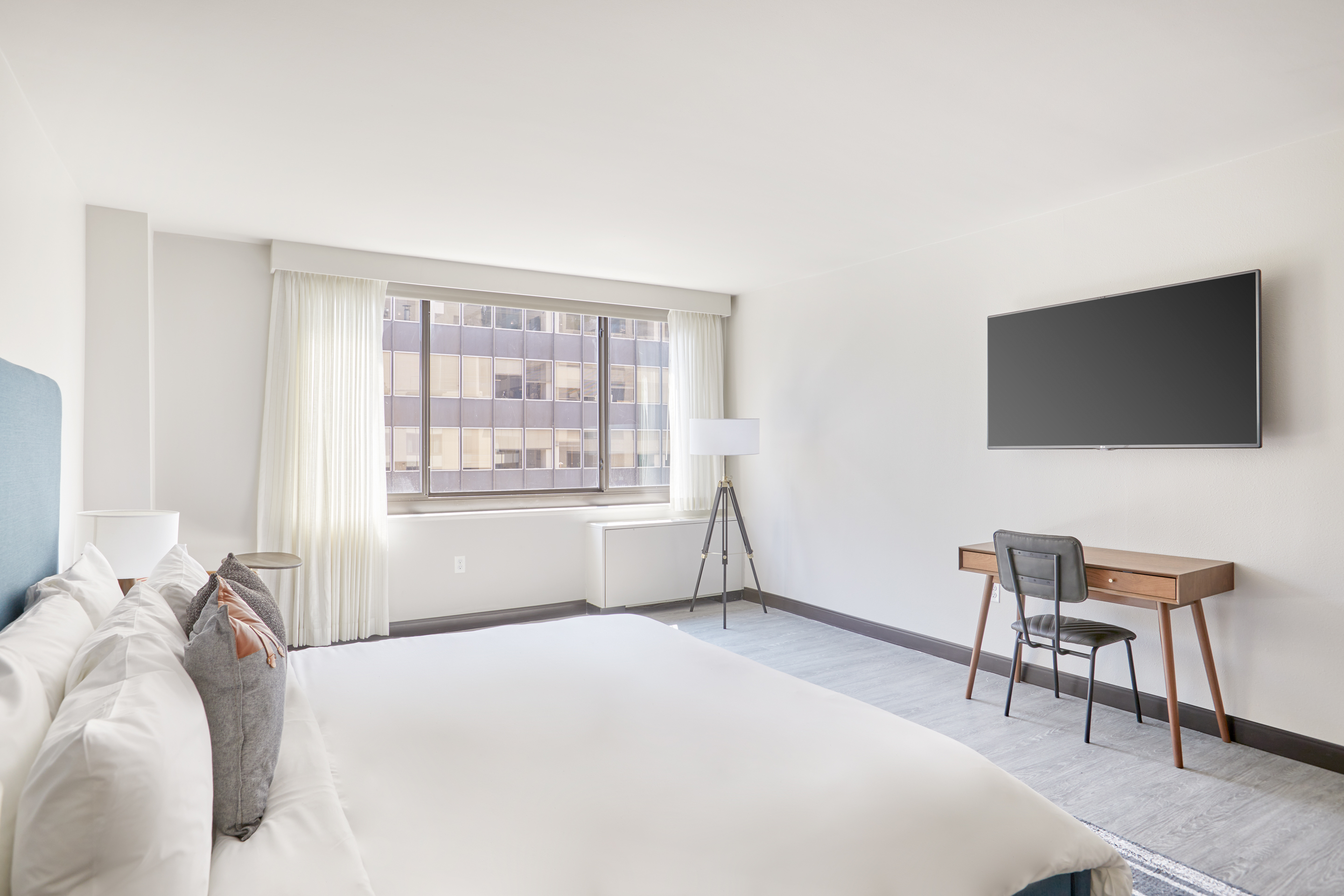 Our spacious guest rooms are your personal oasis, designed with your comfort in mind. Indulge in plush bedding, sleek furnishings and city views. Unwind in style with our exclusive amenities, including full kitchens, state-of-the-art fitness studio, daily morning coffee, smart TVs, valet parking and a meeting room that accommodates 30. Explore the city's iconic landmarks, world-class museums, and thriving arts scene with ease.