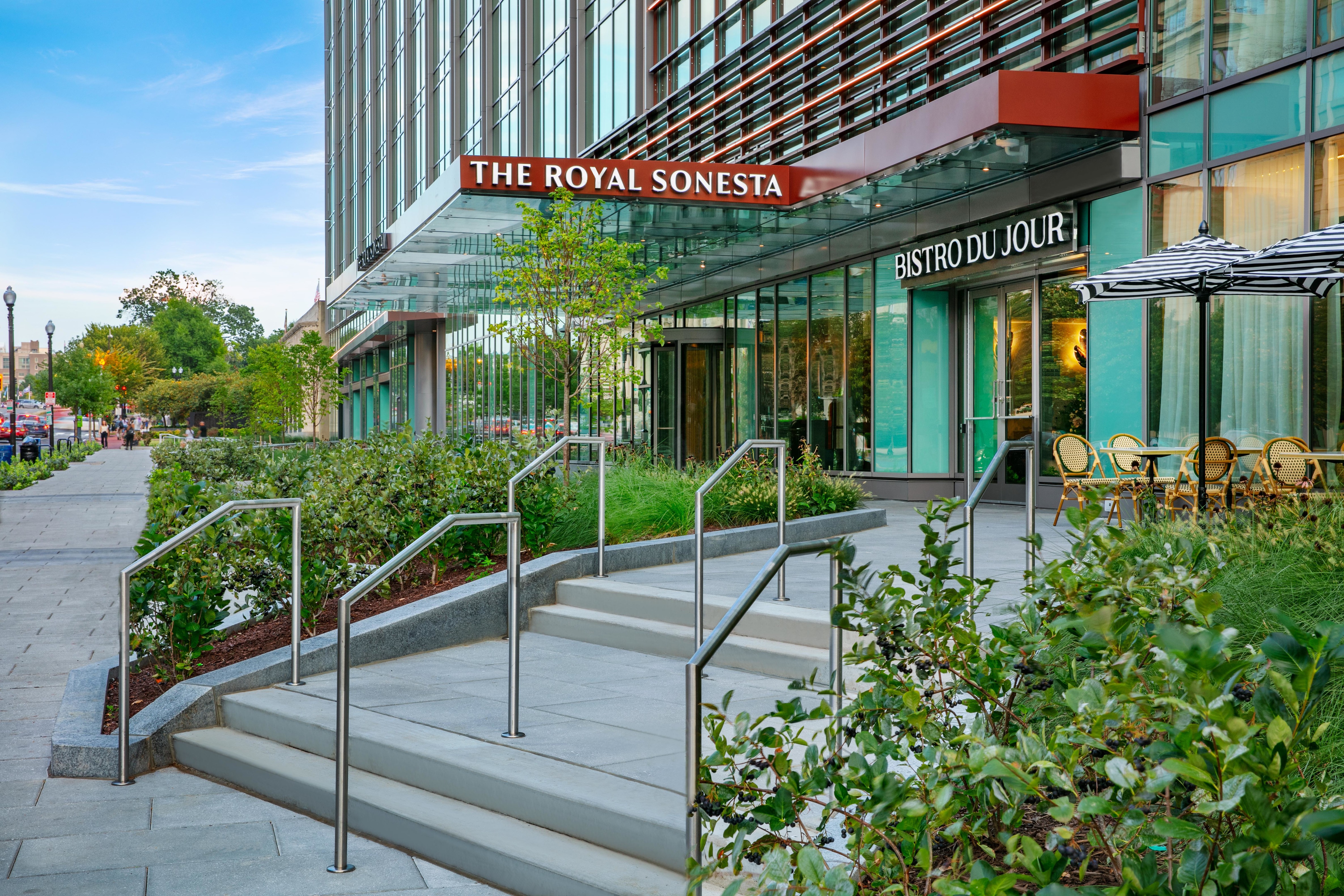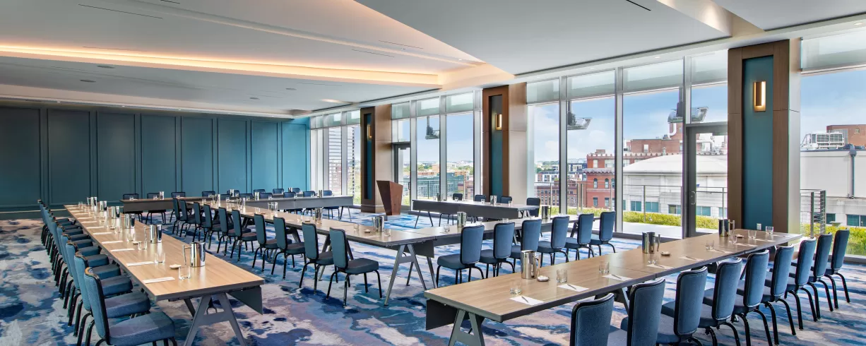 A cleansing palette of neutrals with artistic accents sets a calming tone in our lobby and well-appointed rooms. Our French bistro restaurant promises a sophisticated, savory experience. Embodying the fusion of green, wellness, and tech-forward design, our hotel is LEED Gold Certified with a WELL Certified Core/Shell and boasts an on-site fitness center and yoga studio, EV charging stations and well-equipped networking spaces throughout the property. Our penthouse conference center and ballroom with private terraces offer a breathtaking backdrop, ideal for collaboration or celebration.