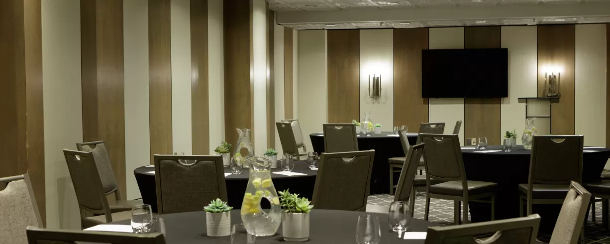 The hotel offers the Leaders Meeting room conveniently located off the lobby level with generous pre-function space for food and beverage events. The mezzanine level offers two boardrooms overlooking the lobby with natural light. All rooms offer built in flat panel screens. Additional AV is offered by our on-site AV company, AVMS. A separate room overlooking the bar area is located on the mezzanine level as a separate area for meal service.